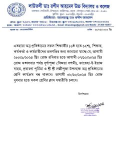 দূর্গাপূজা (বিজয়া দশমী), ফাতেহা-ই-ইয়াজ দাহম, প্রবারণা পূর্নিমা ও শ্রী শ্রী লক্ষ্ণীপূজা উপলক্ষে ছুটির নোটিশ: এতদ্বারা অত্র প্রতিষ্ঠানের সকল শিক্ষার্থীর (৬ষ্ঠ হতে ১২শ), শিক্ষক, কর্মকর্তা ও কর্মচারীদের অবগতির জন্য জানানো যাচ্ছে যে, আগামী ২৮/০৯/২০২৫ খ্রিঃ রোজ রবিবার হতে আগামী ০৭/১০/২০২৫ খ্রিঃ রোজ মঙ্গলবার পর্যন্ত দূর্গাপূজা (বিজয়া দশমী), ফাতেহা-ই-ইয়াজ দাহম, প্রবারণা পূর্নিমা ও শ্রী শ্রী লক্ষ্ণীপূজা উপলক্ষে অত্র প্রতিষ্ঠানের শ্রেণি কার্যক্রম বন্ধ থাকবে। আগামী ০৮/১০/২০২৫ খ্রিঃ রোজ বুধবার হতে সকল শ্রেণির ক্লাস যথারীতি চলবে। Leave a Comment / By Editor / September 27, 2025